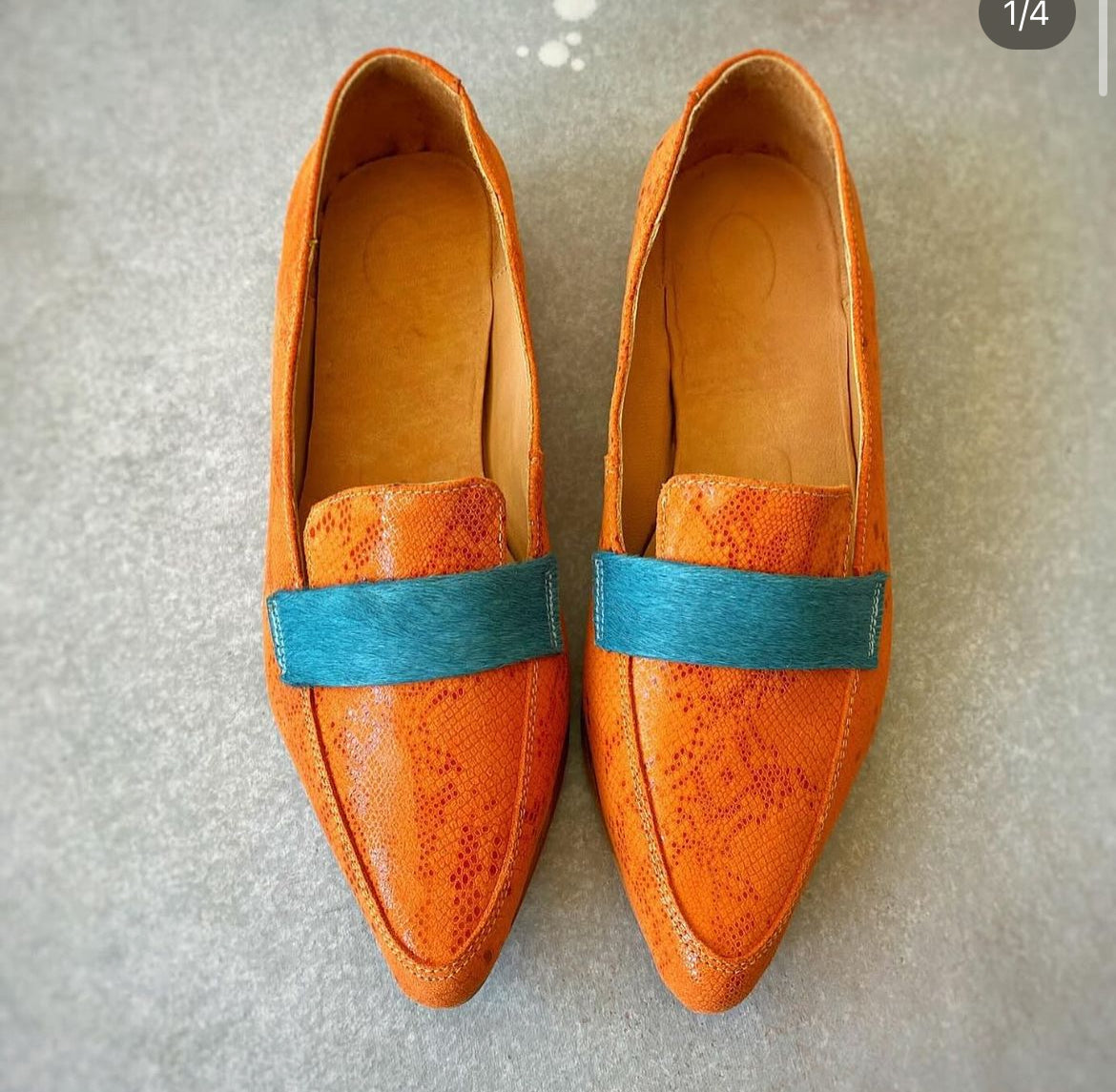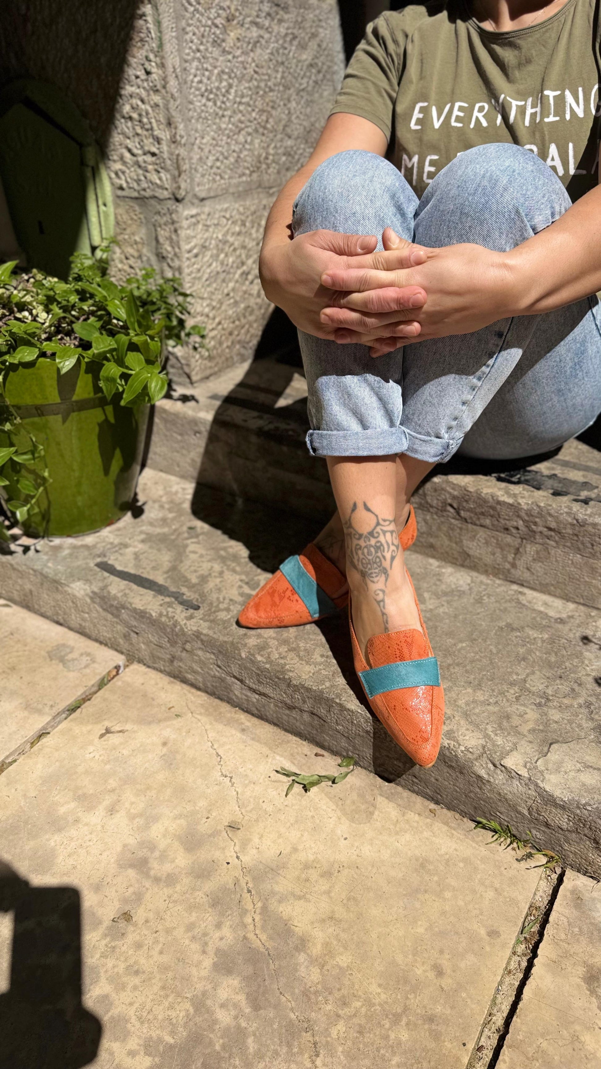 Mocassim 100% em pele com salto de aproximadamente 2 cm. Cor laranja com detalhe em calipso. Este mocassim destaca-se pelo conforto e pelas cores originais, conferindo-lhe um aspeto mais divertido e colorido.