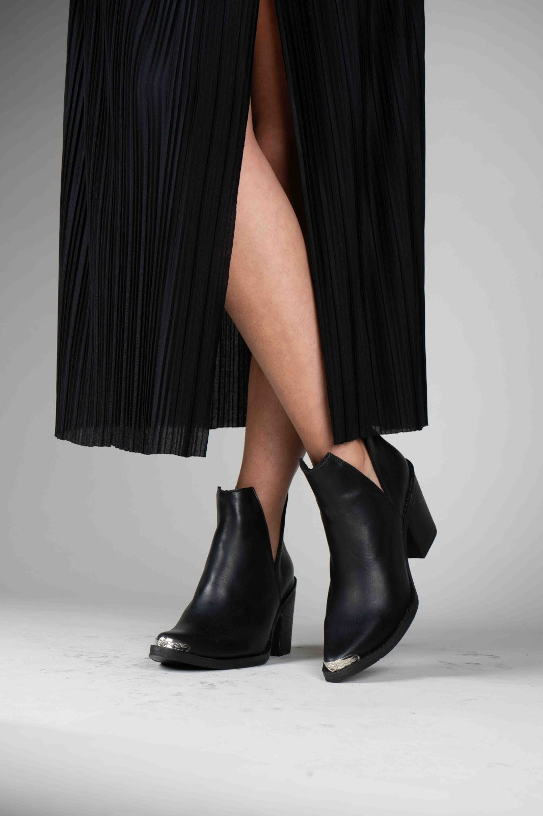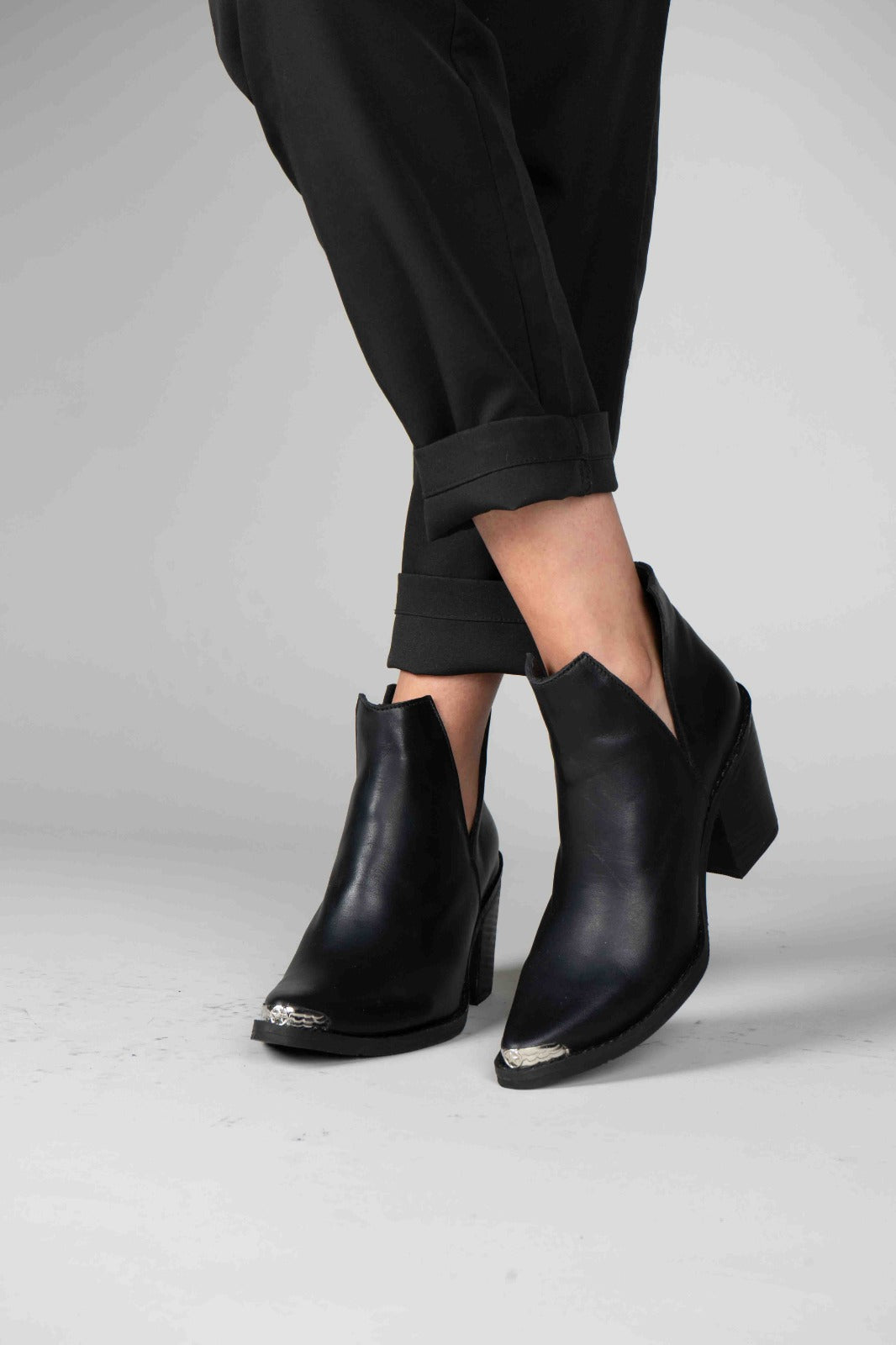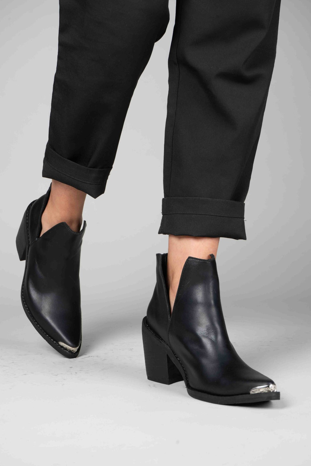 Bota de cano curto 100% pele, salto de aproximadamente 7 cm. Detalhe estético de abertura lateral acrescenta originalidade. Ponta com rebite de metal que dá um toque roqueiro.