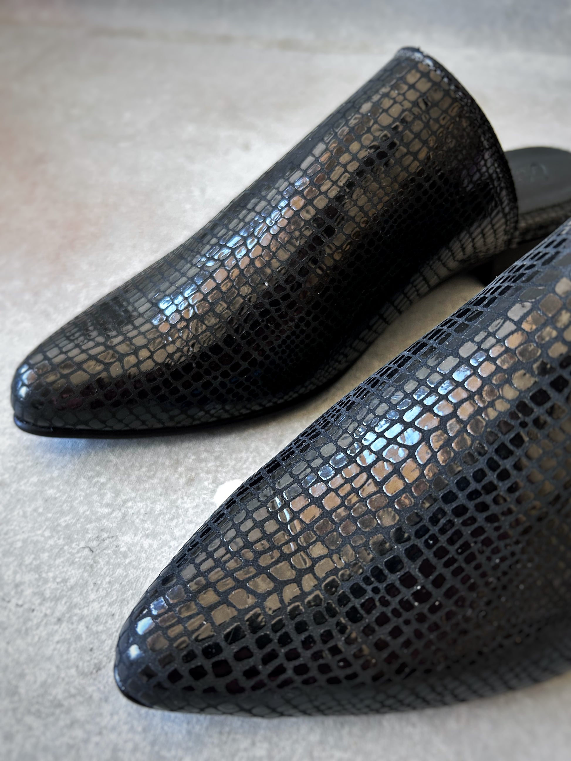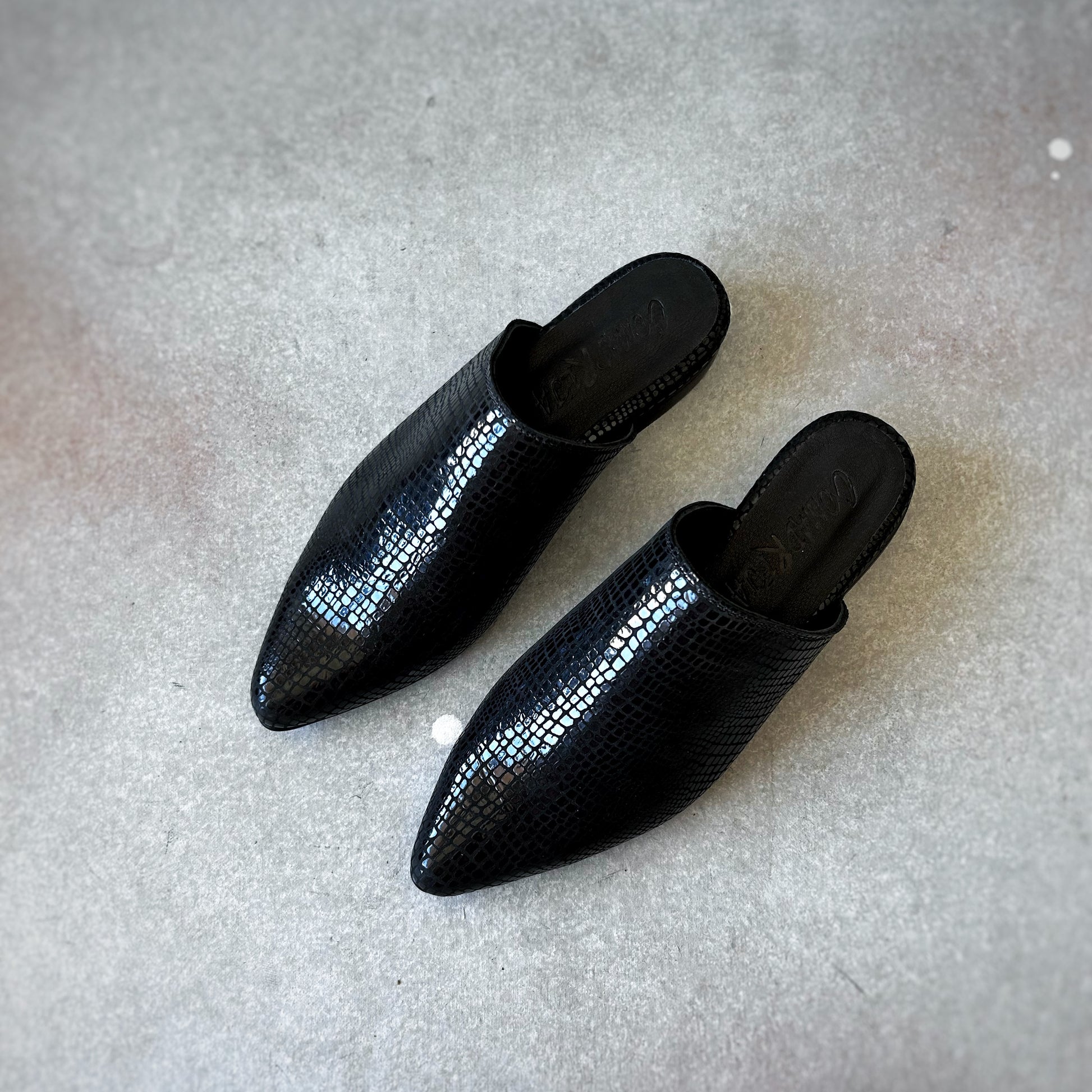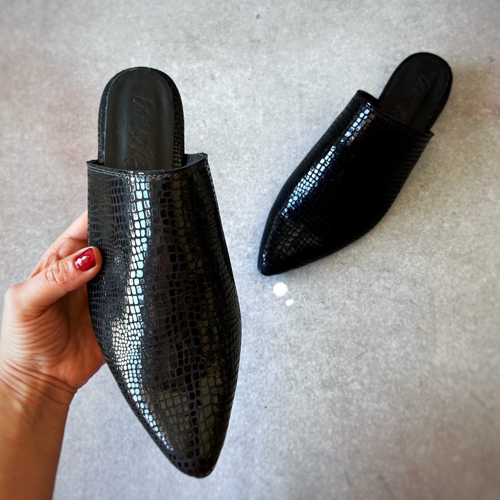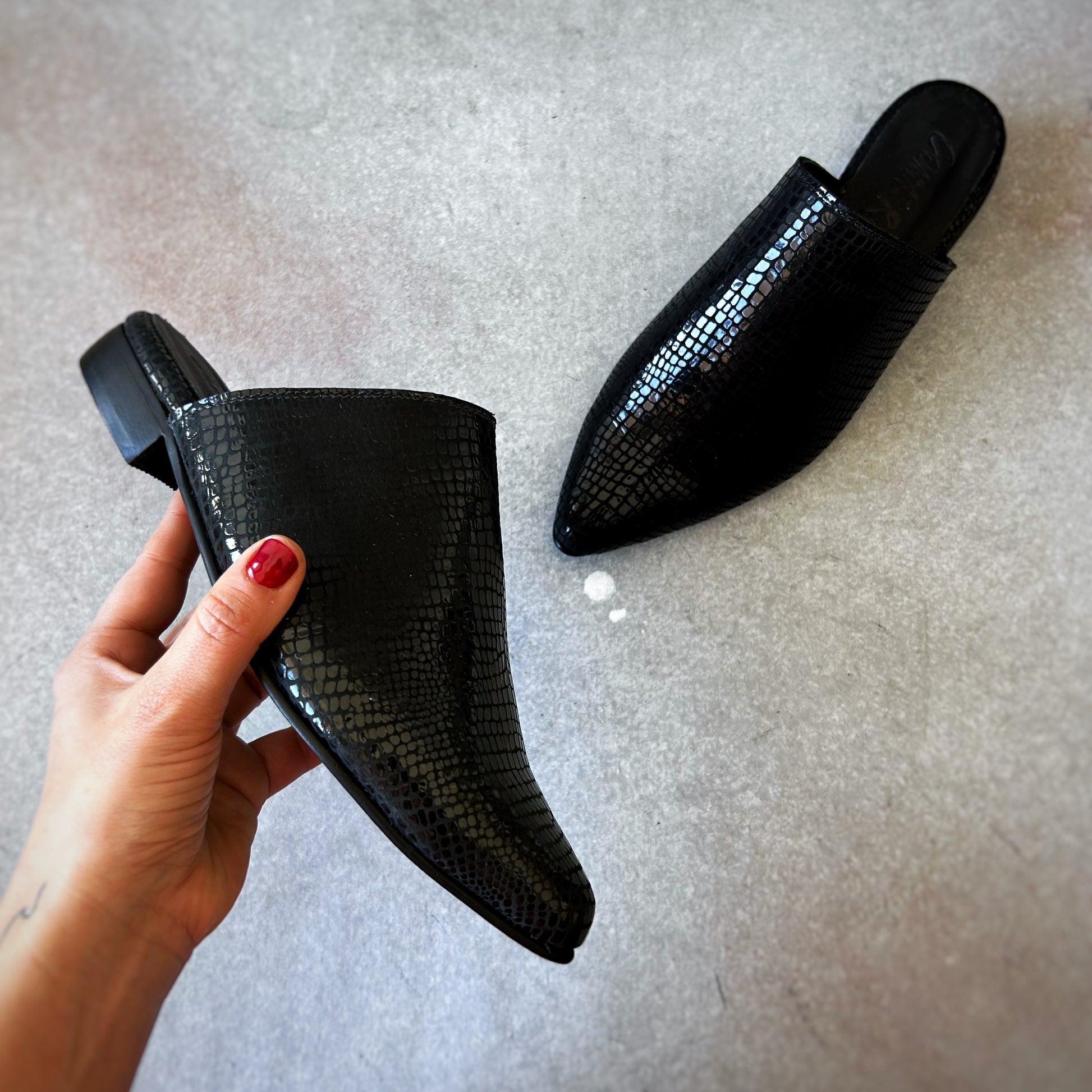 Mules longa, feita 100% couro preto brilhante. Salto de aproximadamente 3 cm. Elegantes e diferentes, estas mules vão, sem dúvida, elevar o seu look. Atemporais e versáteis, elas darão um toque especial a qualquer outfit.