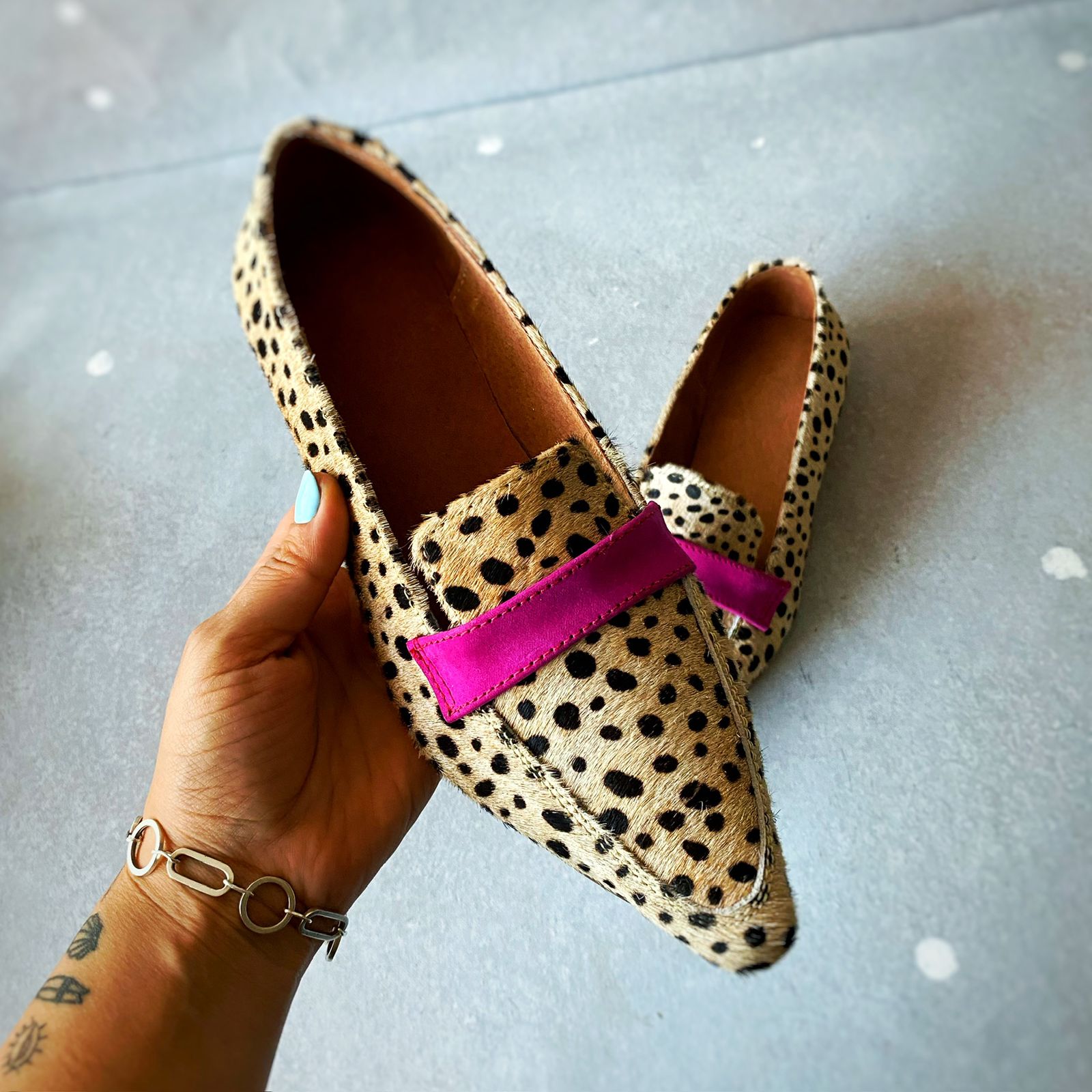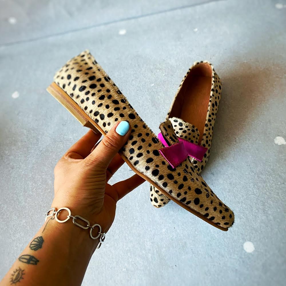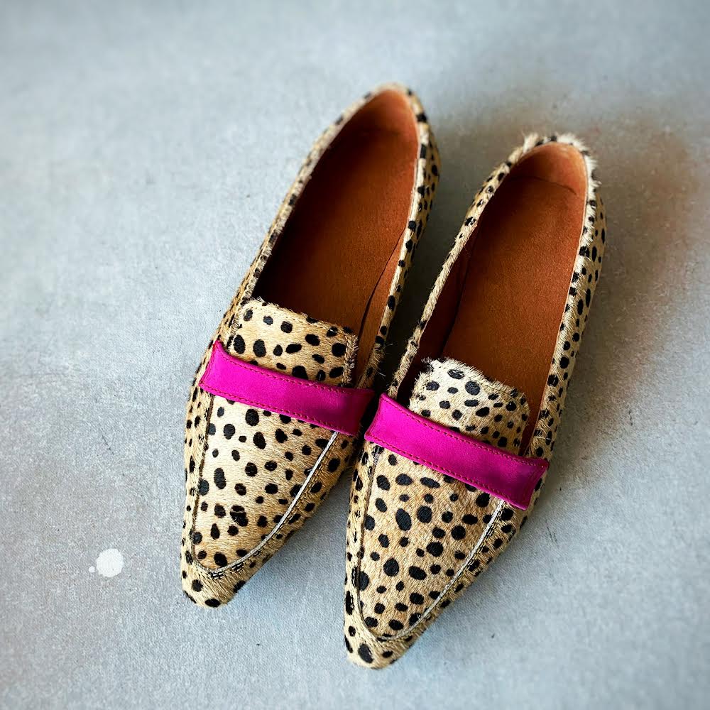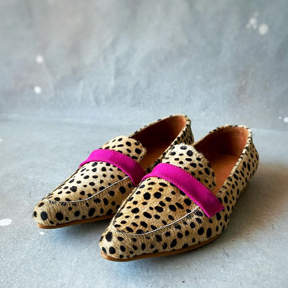 Mocassim 100% couro com textura animal print e um toque de fúcsia para um contraste divertido. Salto de aproximadamente 1 cm. Muito confortável e original.