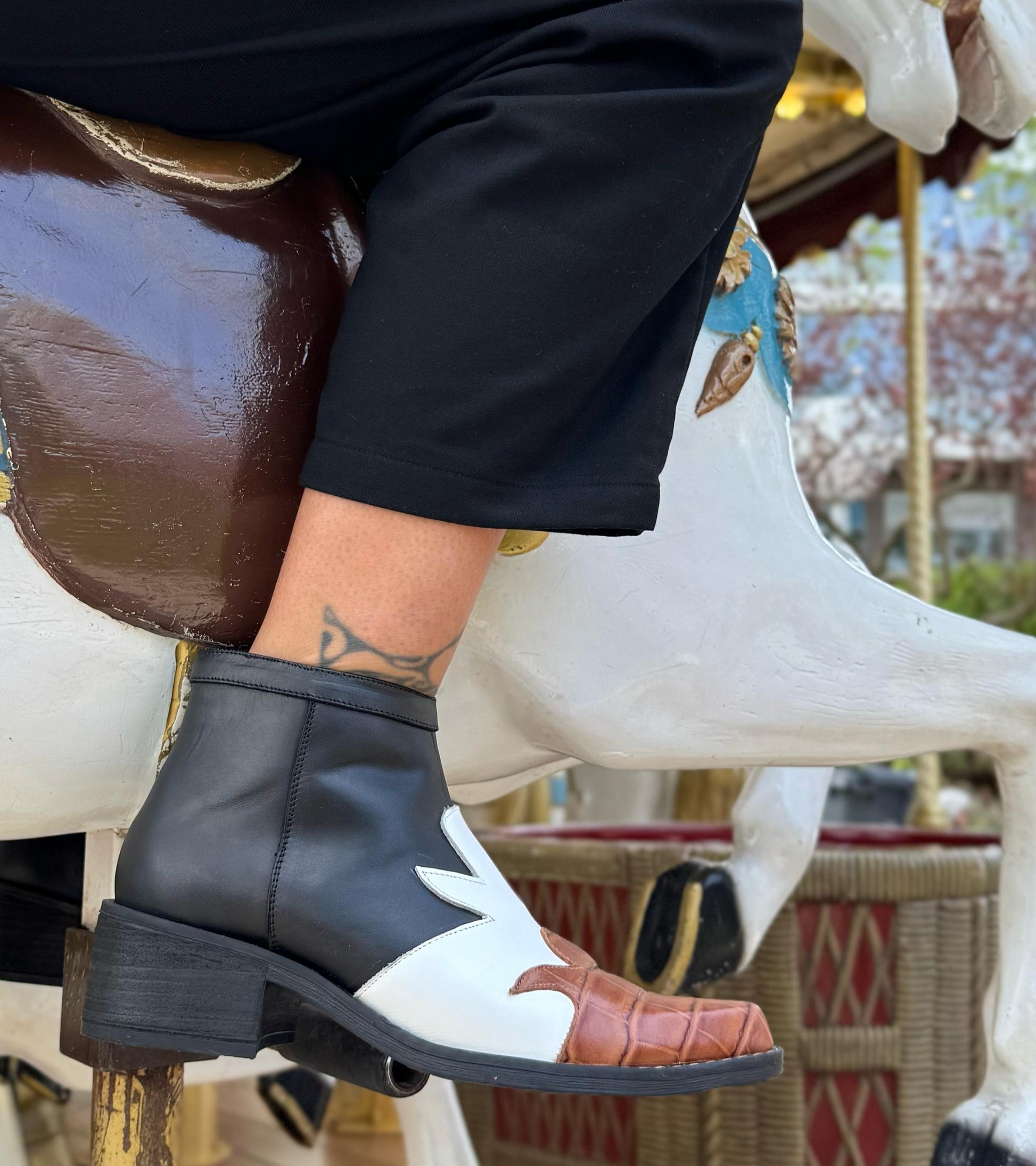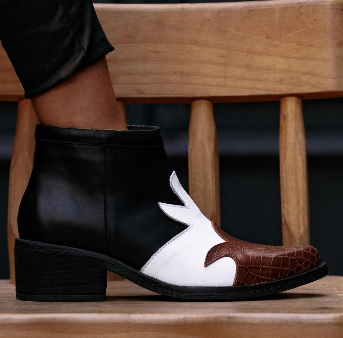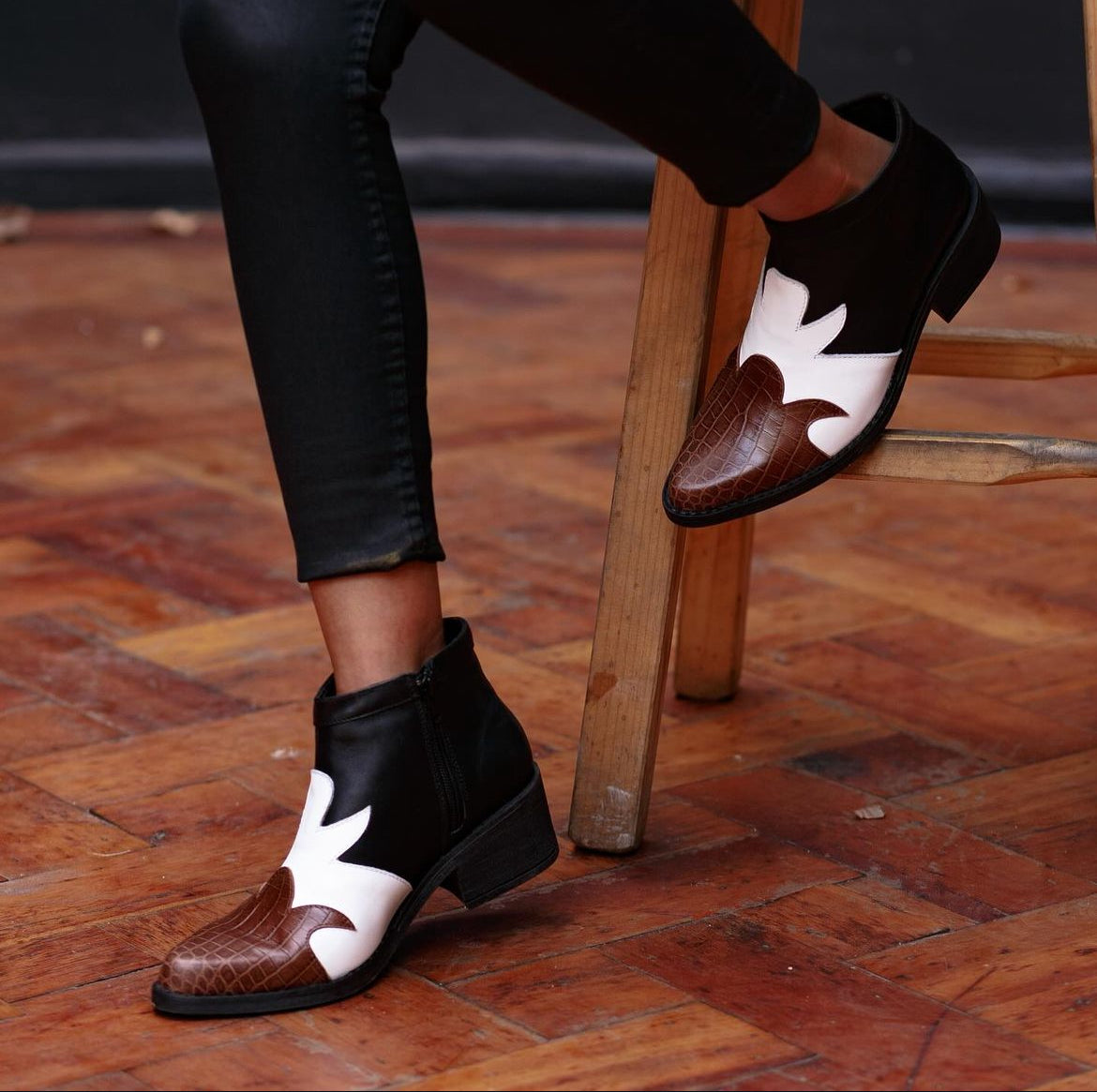 Botim 100% pele, salto de 5cm aprox. Feito em couro tricolor com um design elegante e moderno. Combina couro castanho na parte frontal, a seguir de couro branco nas, e couro preto na parte superior e nos detalhes. Com fecho lateral e sola antiderrapante, é ideal para um estilo urbano e sofisticado.