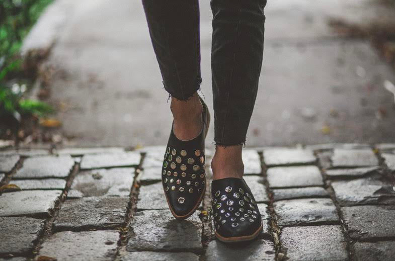 Babucha 100% em couro preto com tachas de inspiração rockeira. O salto de 3 cm oferece altura com o máximo conforto, num design versátil que se destaca pela sua personalidade e estilo.