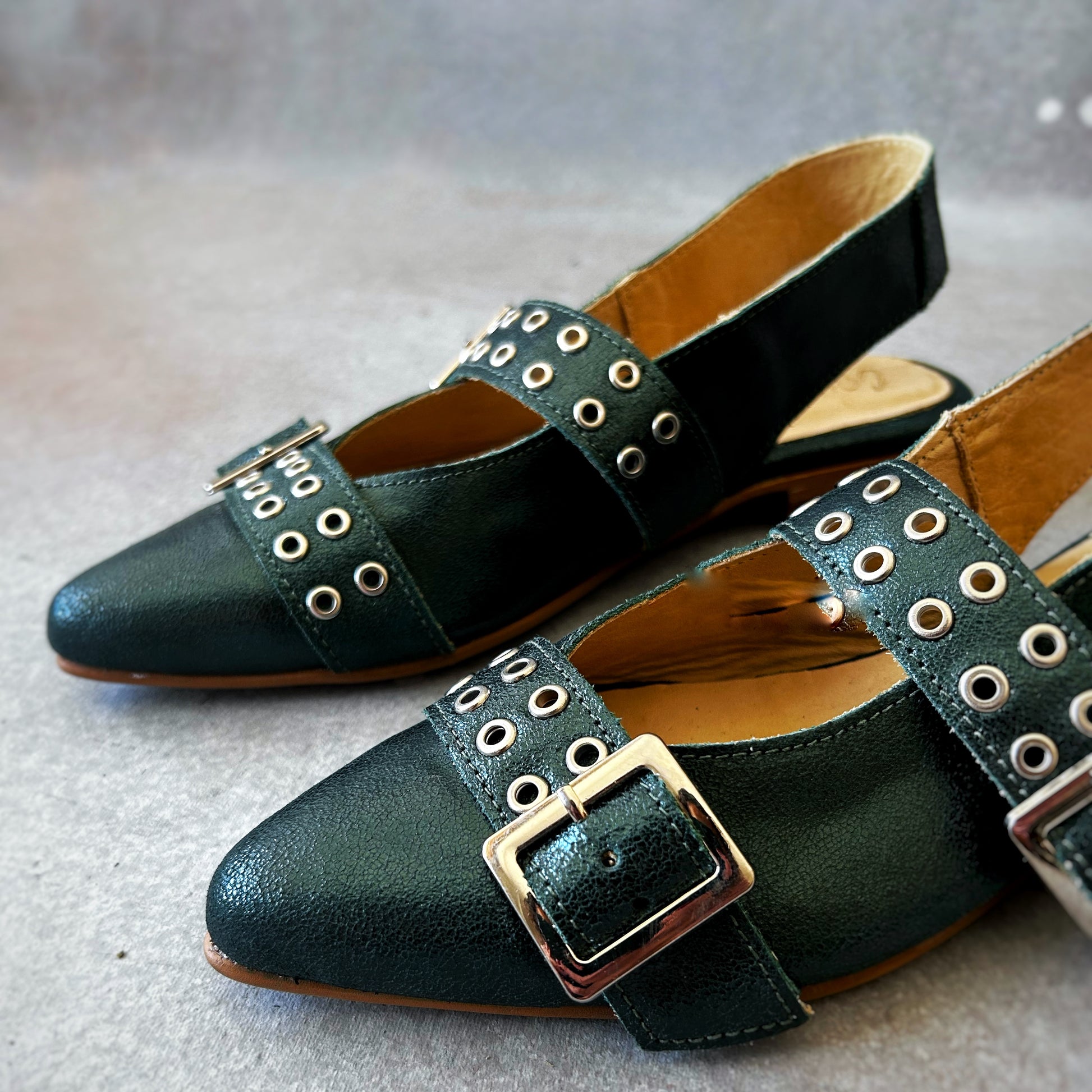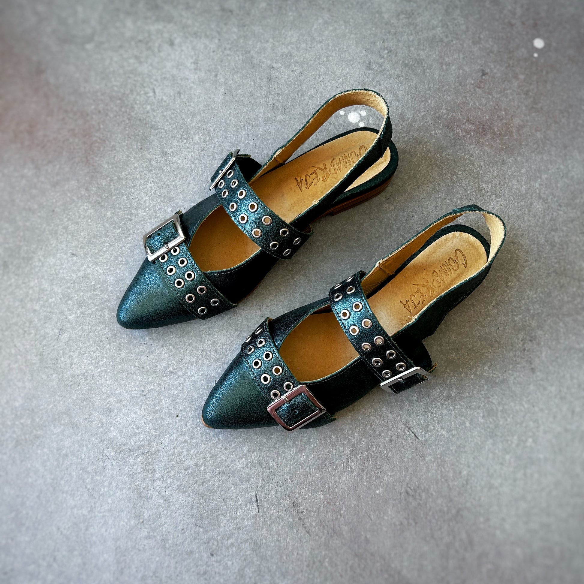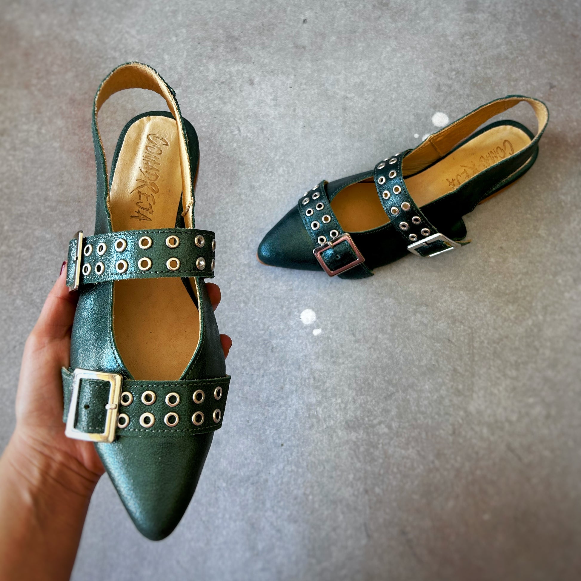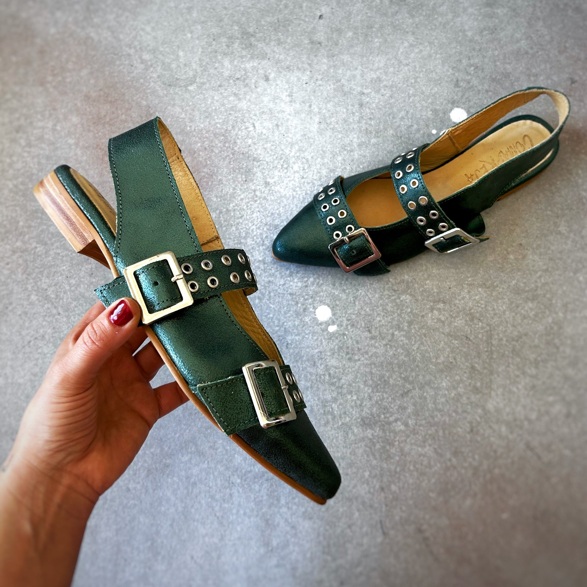 Sapato tipo ballerina verde brilhante com duas tiras ajustáveis com fivelas e delicadas tachas metálicas. Com salto de aproximadamente 2 cm, combina feminilidade, carácter e conforto num design contemporâneo.