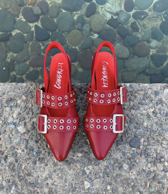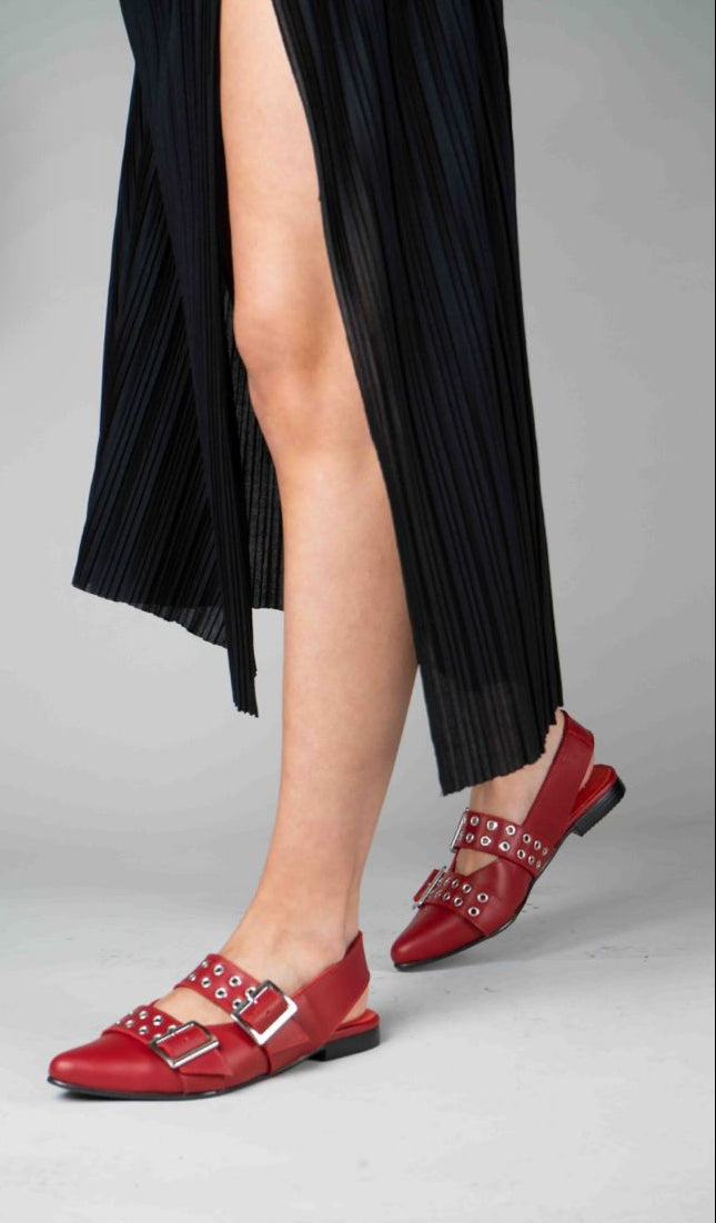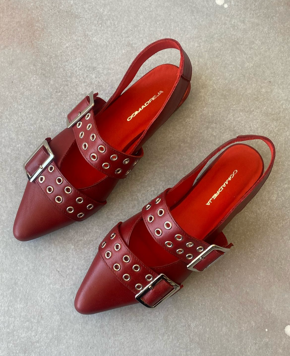 Sapato tipo ballerina, 100% em couro vermelho com duas tiras ajustáveis com fivelas e delicadas tachas metálicas. Com salto de aproximadamente 2 cm, combina feminilidade, carácter e conforto num design contemporâneo.