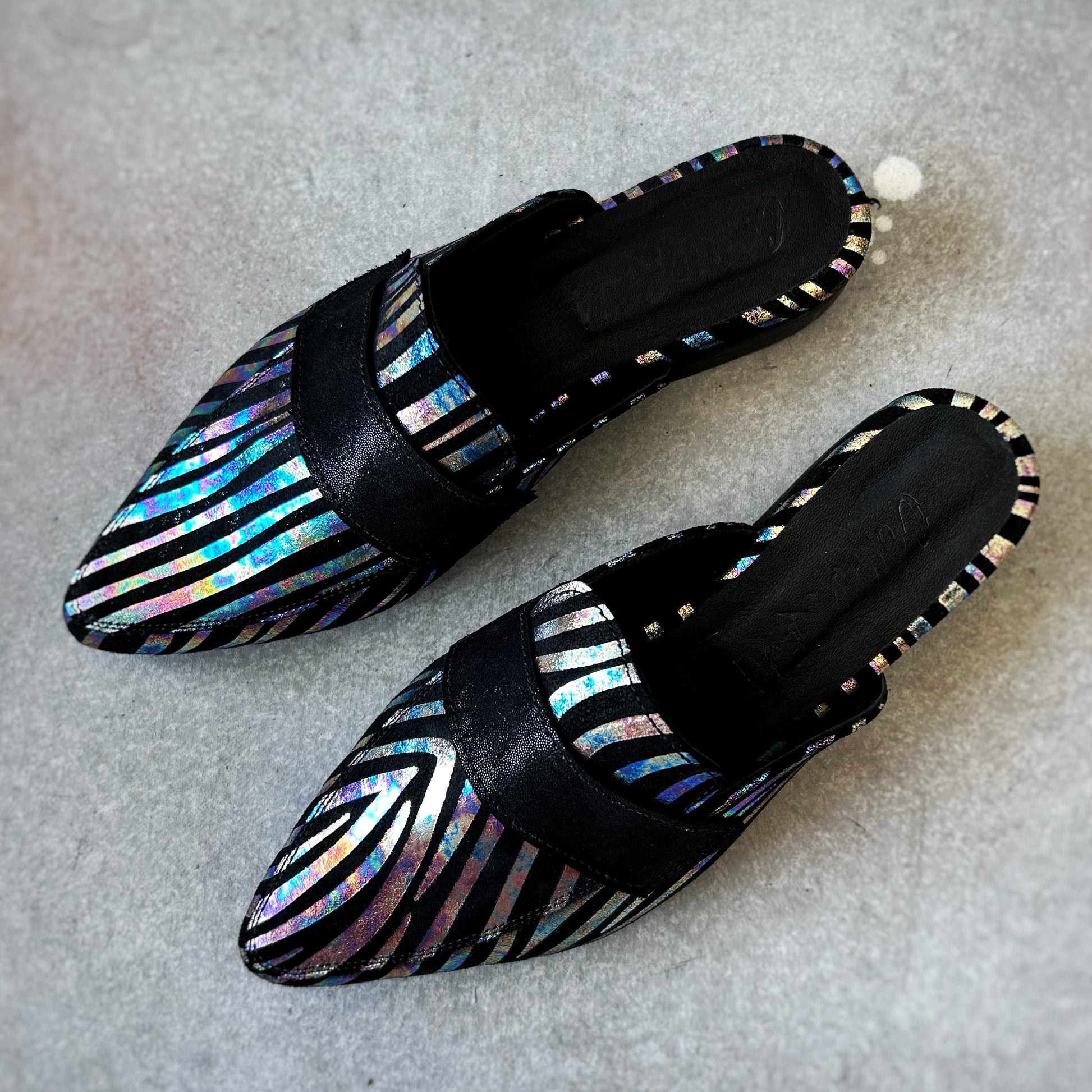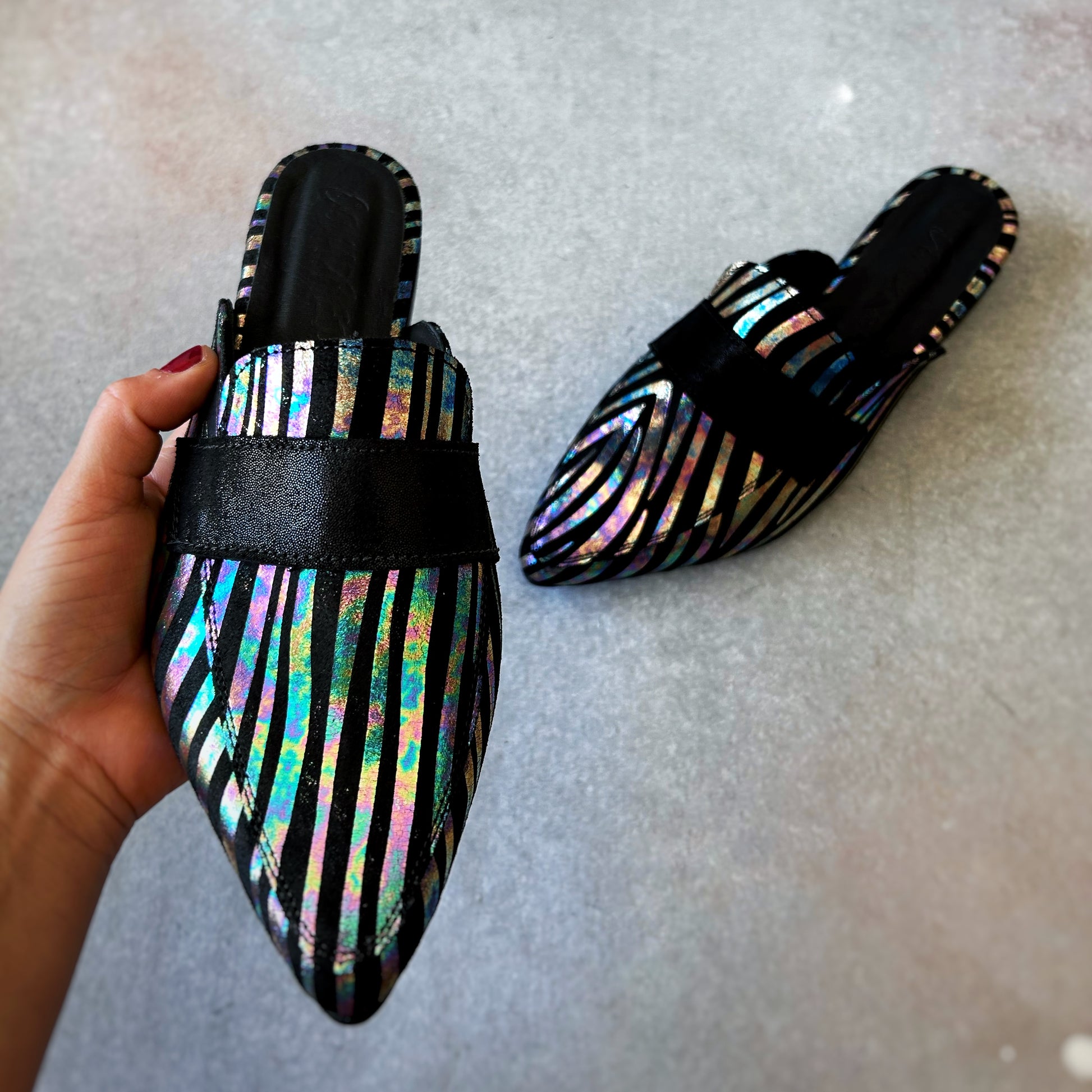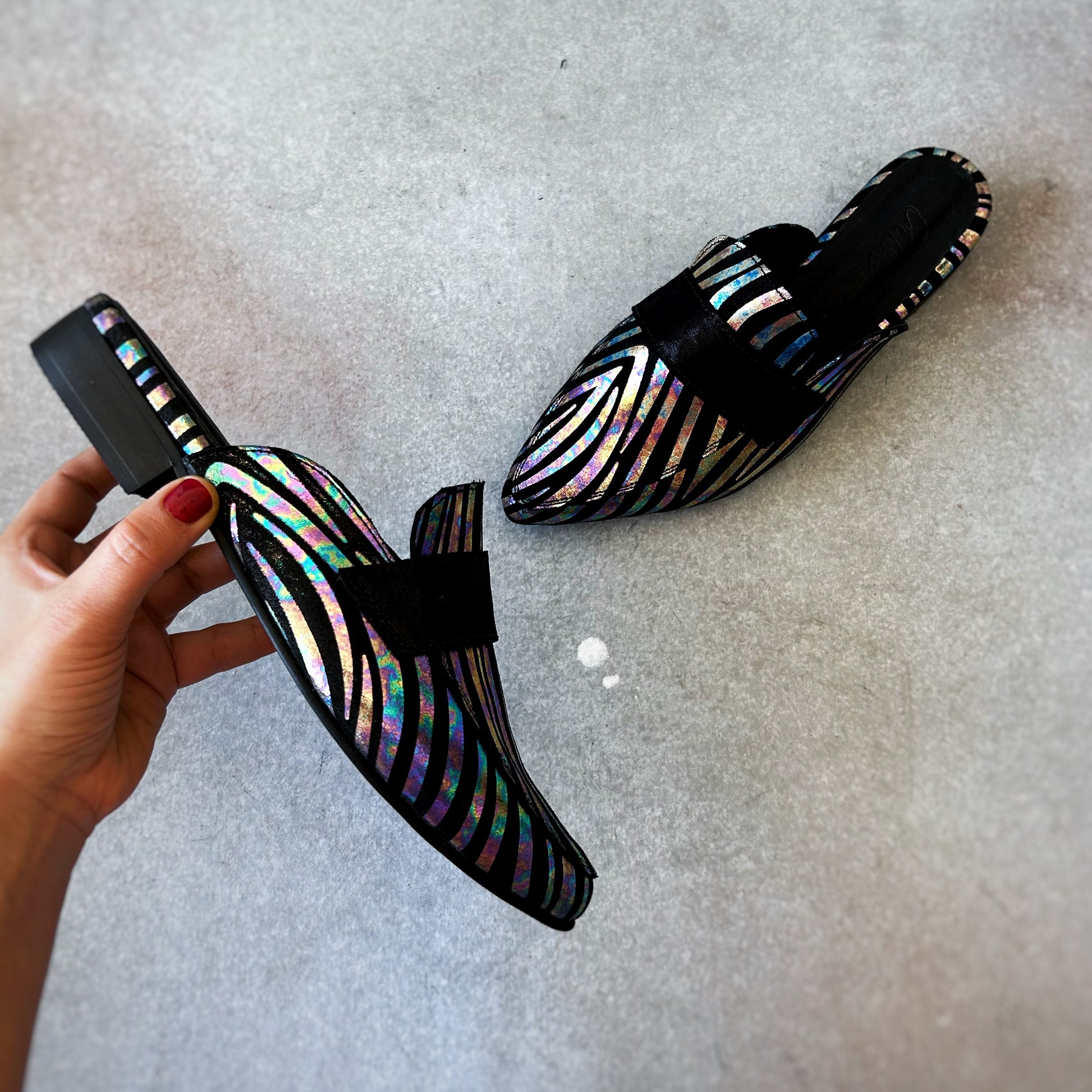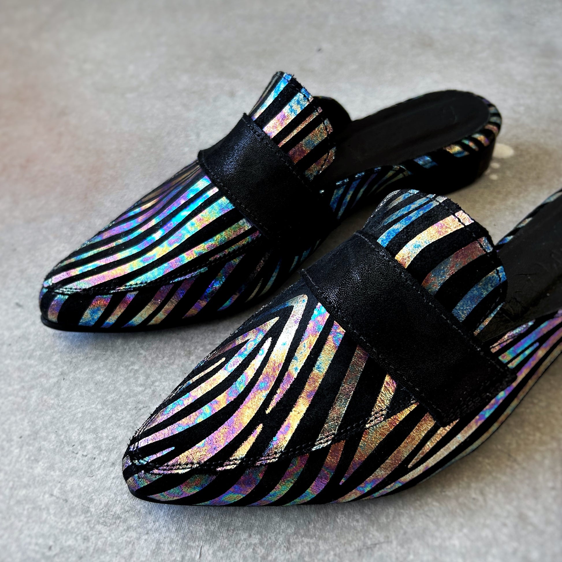 Mules tipo mocassim com padrão de zebra tornassolado e salto de aproximadamente 3 cm. Um modelo original e distinto que eleva qualquer outfit com o seu brilho subtil, combinando estilo, conforto e versatilidade.